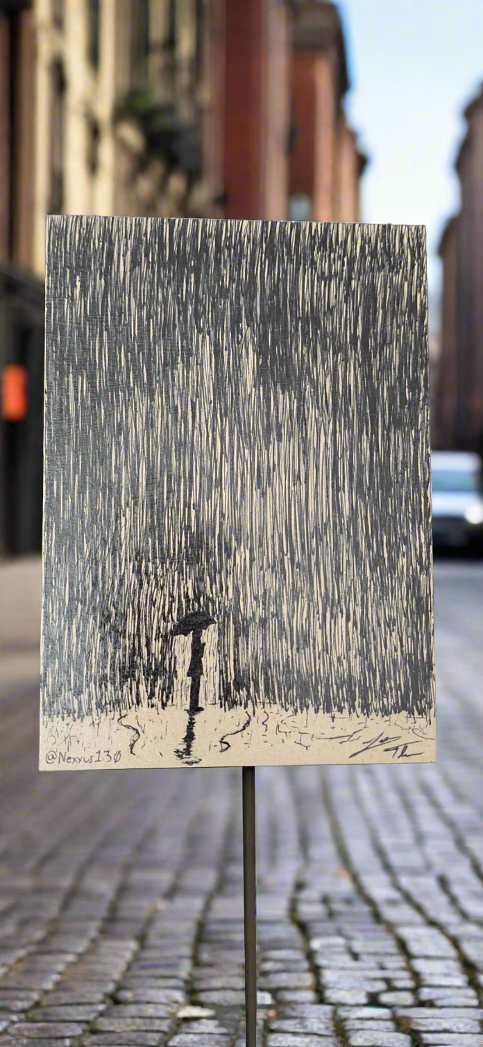"Alone in the Rain" 5inx7in Pen on chipboard